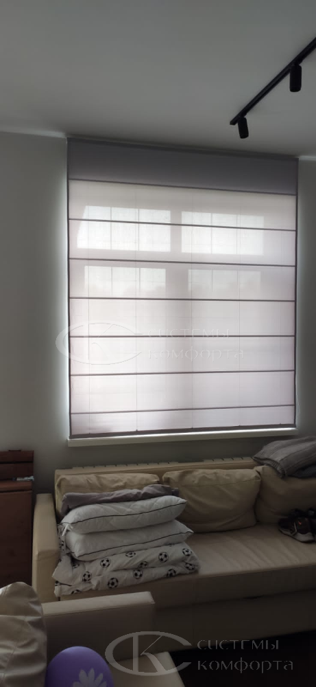 - Рулонные шторы «День-Ночь» («Зебра»). Инновационный продукт, ставший хитом для жилых помещений. Полотно состоит из чередующихся прозрачных и непрозрачных полос. Сдвигая их относительно друг друга, вы плавно регулируете освещенность от полупрозрачного мягкого света до полной приватности. Это удобное и функциональное решение для гостиной или кухни-столовой.